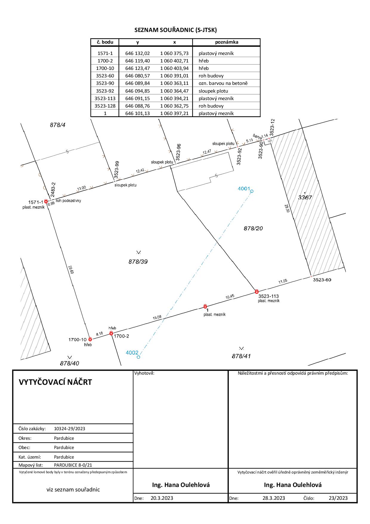 - vytyčené lomové body označíme požadovanou stabilizací (hraničními znaky, kolíky, hřeby)